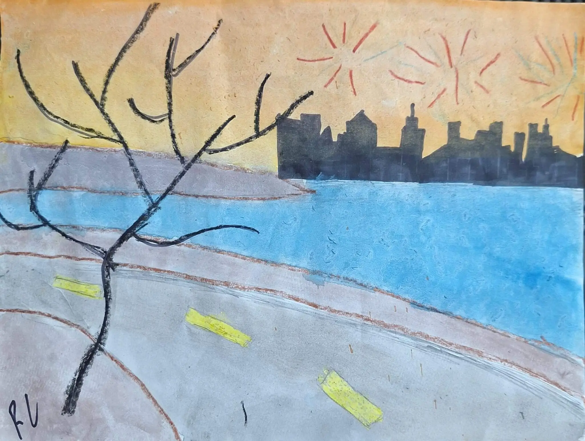 I really enjoy art and think it is very fun and intresting. I enjoyed painting this piece because it reflects a city at dusk. It makes me want to go outside and look at nature. It also gives me the feeling of riding in a car and looking out the window, seeing in the city.