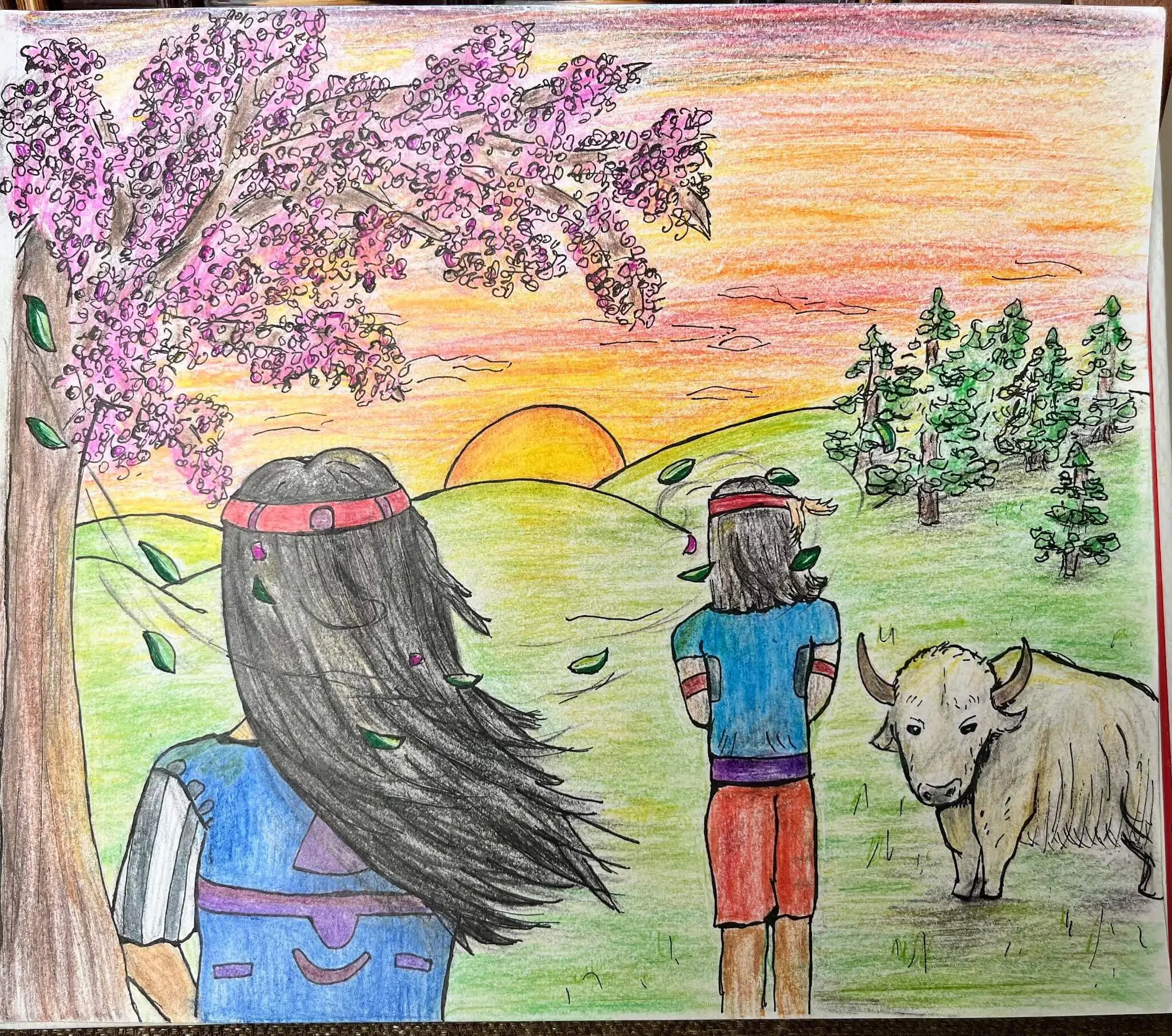 I chose to depict a woman, a man, and a white buffalo in the Great Plains of North America as something that inspires me because, for Native Americans, buffalos are a creature of extreme significance to them. Especially in the Lakota tribe, white buffalos are regarded and revered as a symbol of hope, renewal, and prosperous futures. They serve as reminders to the respect and balance needed between humans and nature - at the white buffalo's side, the two humans stand in harmony with nature.