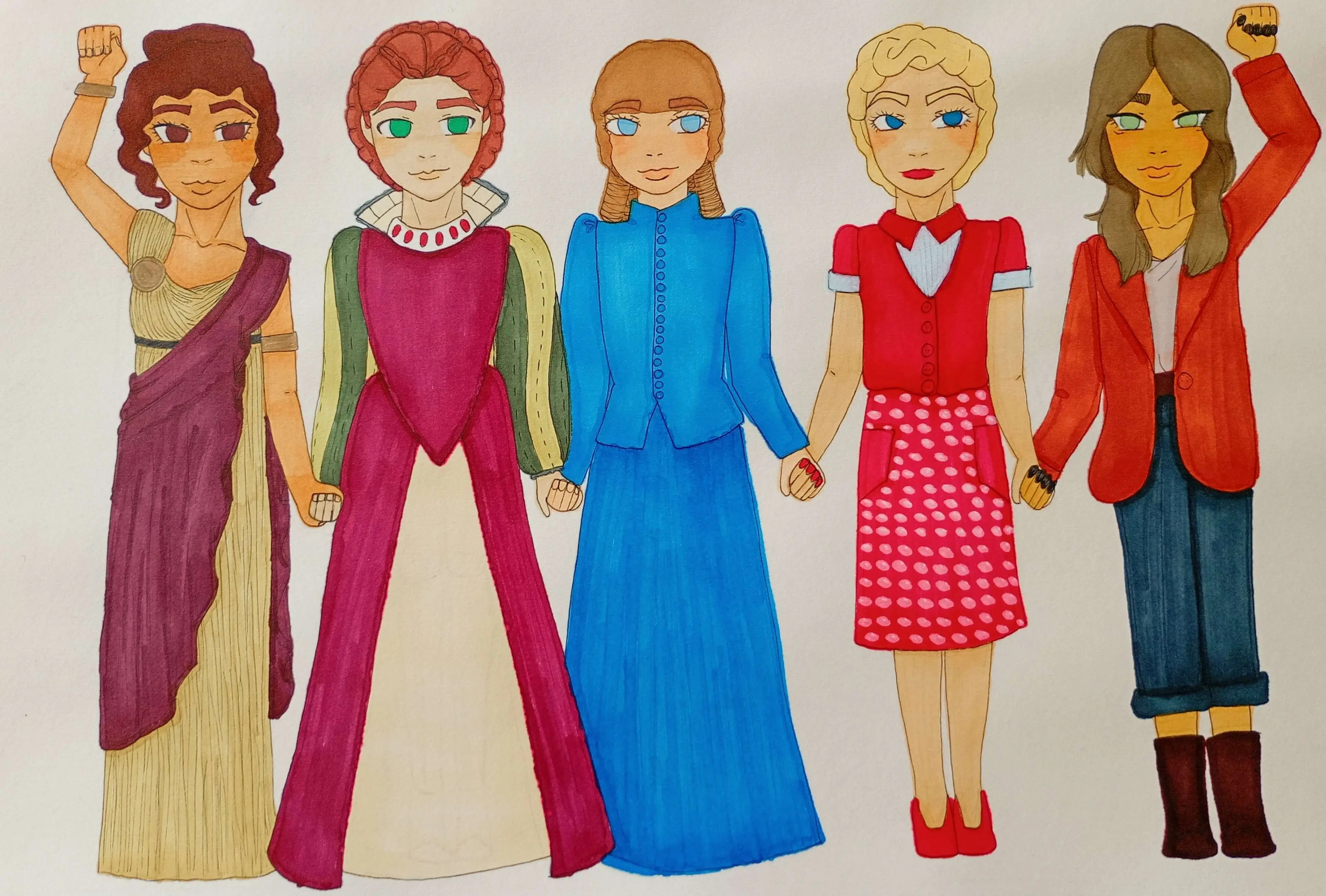 Hi! My name is Sami and I am 16 yrs old. I want to be a fashion designer when I'm older, so I decided to do a fashion inspired piece. From left to right the different era's are: Ancient Greece, Renaissance, Victorian, 1950's and Modern Day. Ancient Greece is an extra special era to me as I love Greek Mythology. My picture shows the ladies holding hands to represent the various era's of fashion history that designers still draw upon today.