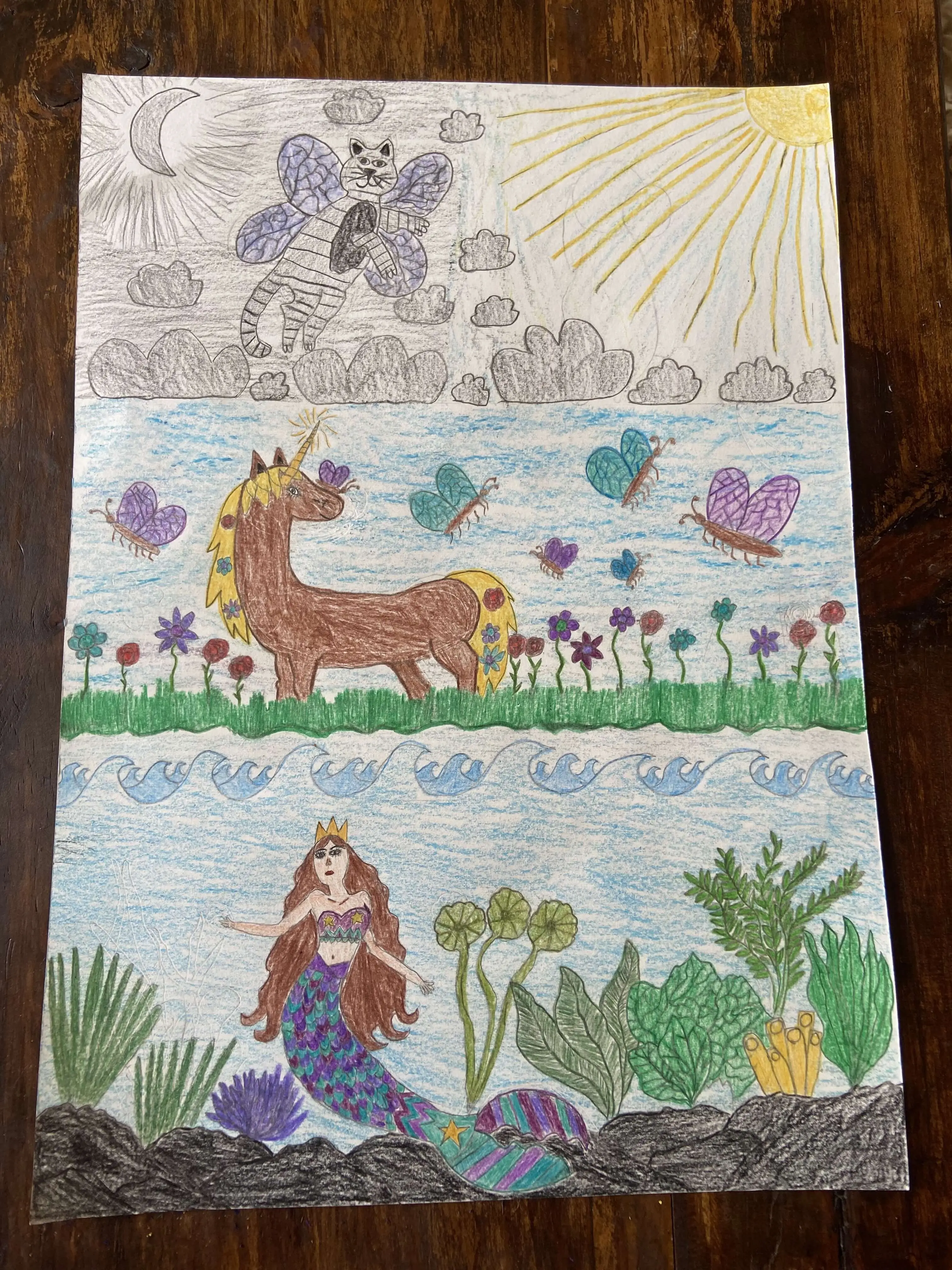 I love to tell stories. I wanted to tell a story of my own in my picture and so I did. My picture is a story about a little mermaid, unicorn, and flying cat. They all are different and all have their own story but all of their stories are a story of my own.