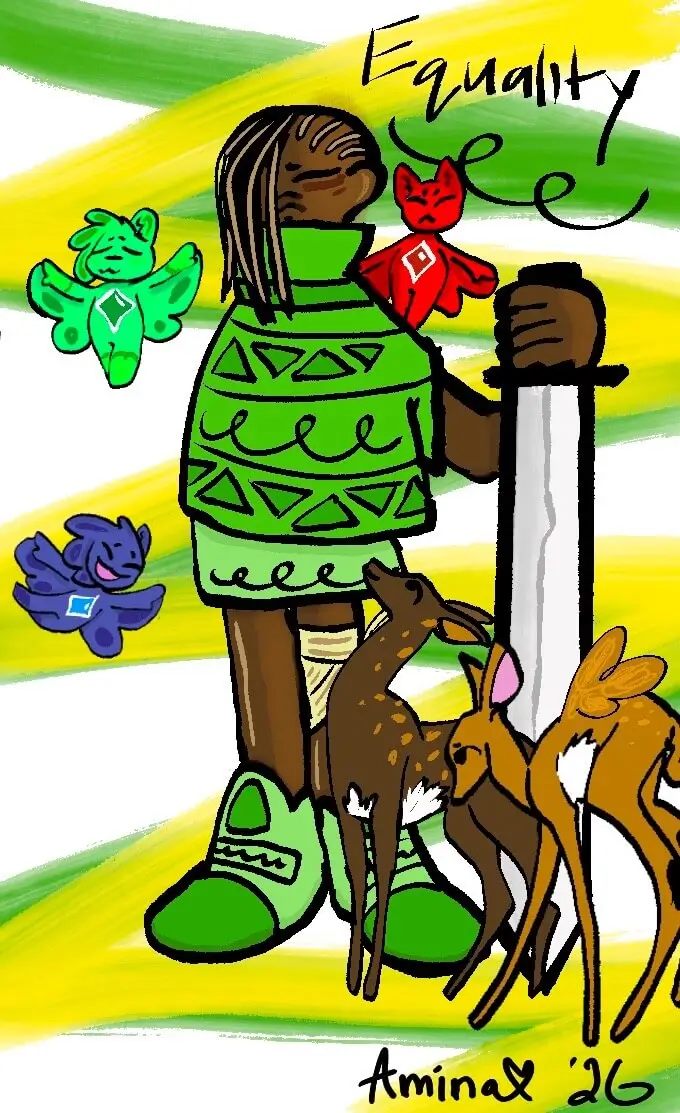 I am Amina, and I love sketching on my pad, and coloring on procreate. My inspiration for the piece was actually a homework assignment! I was asked to do a drawing of my own deity, god or goddess to present, and here it is! This girl you see here is Equality, the deity of balance. She is the one who keeps things equal between humans, plants and animals. This piece makes me feel proud.